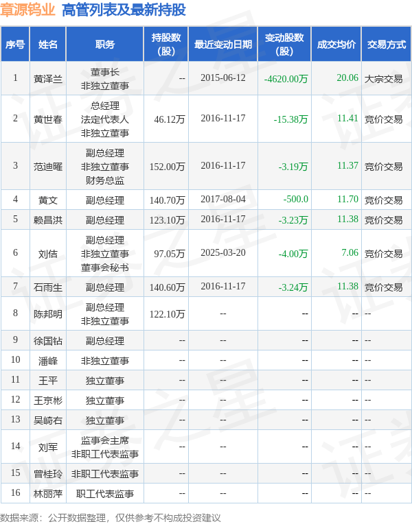章源钨业近半年内的董监高及核心技术人员增减持详情如下: